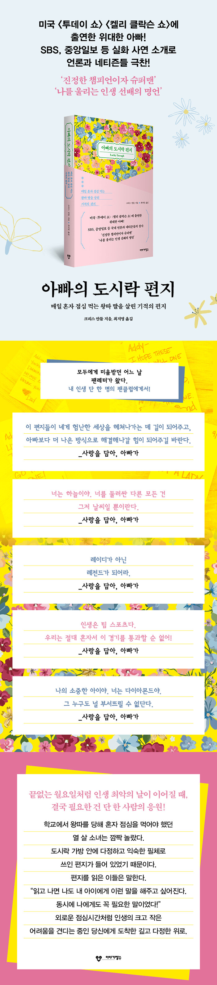 도시락 편지는 딸이 가장 예민하고 상처도 많이 받는 시기인 ‘마의 열 살’을 무사히 넘기고, 고등학교 졸업식이 다가오는 지금까지도 계속 이어지고 있다. 매일 외로운 점심시간처럼 인생의 크고 작은 어려움을 견디는 중인 당신에게도 깊고 다정한 위로가 될 것이다.
