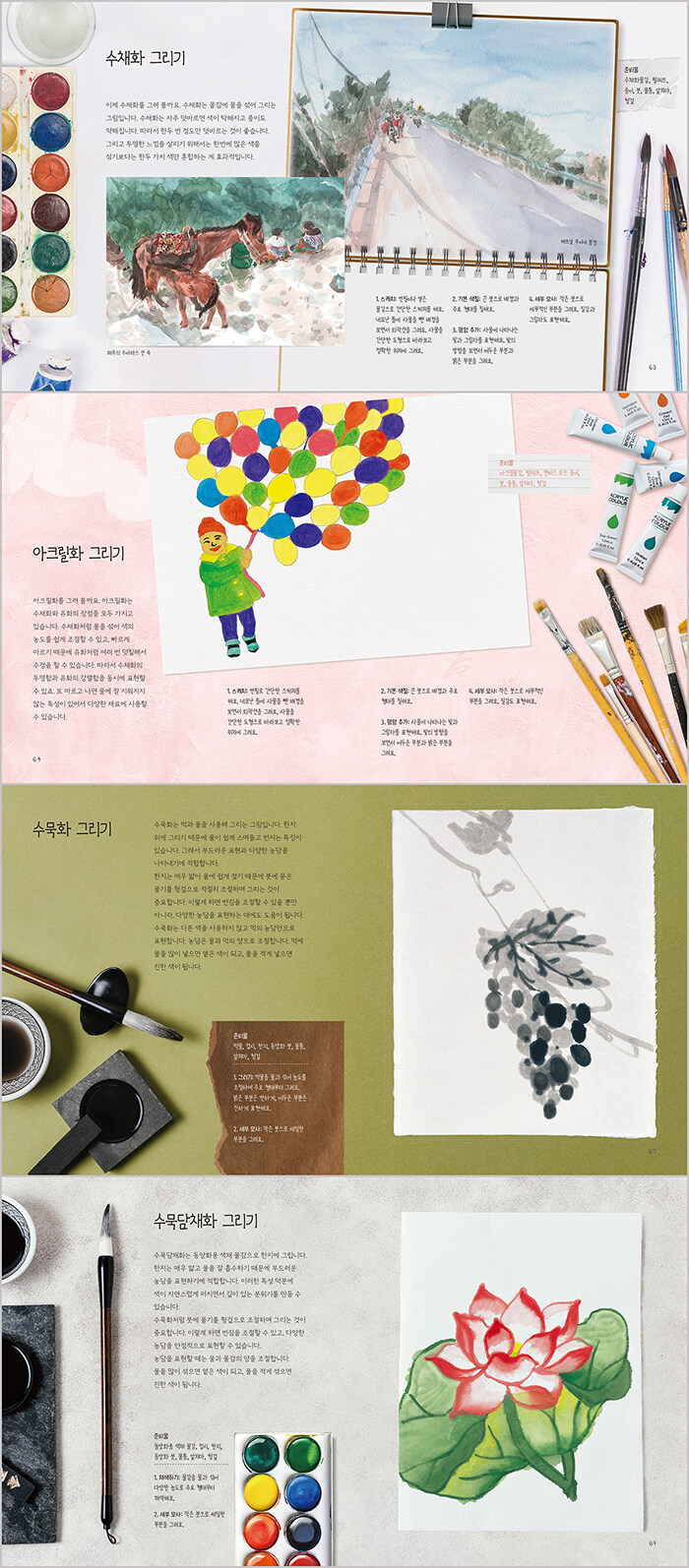 다양한 재료로 표현의 폭을 넓히는 구성연필과 붓만 사용하던 기존의 그리기 방식에서 벗어나 스펀지, 나뭇잎, 검은 도화지, 돌멩이 같은 다양한 재료를 활용하는 방법을 담았다. 주변에서 쉽게 구할 수 있는 재료만으로도 새로운 표현이 가능하다는 점을 보여 주어 그림을 보다 자유롭고 흥미롭게 경험하게 한다.