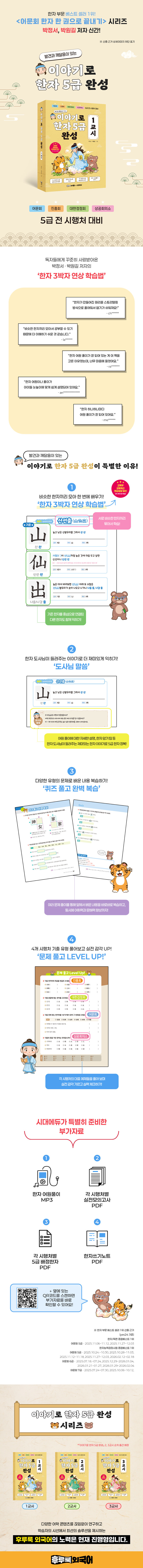총 3권으로 연계 구성된 『이야기로 한자 5급 완성』 1, 2, 3교시 수업을 모두 듣고 나면, 5급 수준의 필수 한자를 완벽히 익힐 수 있고, 어문회, 대한검정회, 진흥회, 상공회의소 총 4곳의 시행처에서 주관하는 시험에 응시할 만한 실력을 갖출 수 있어요.