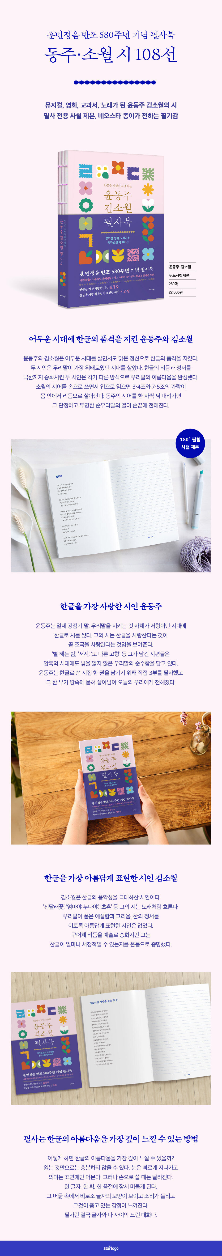 필사전용 사철제본 그리고 네오스타 종이가 전하는 필기감!!2026년은 세종대왕이 훈민정음을 반포한 지 580주년이다. 이 필사북은 그 뜻깊은 해를 기념하기 위해 한글을 가장 사랑하고, 가장 아름답게 표현한 시를 남긴 윤동주와 김소월의 시 108편을 직접 써볼 수 있도록 필사전용 제본으로 만든 책이다.