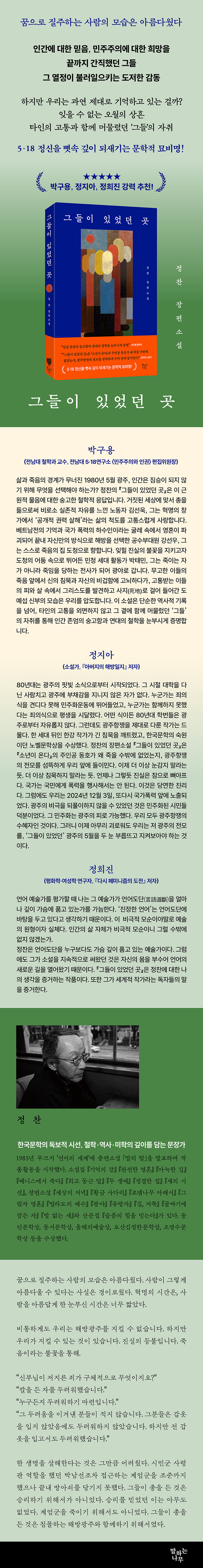 한반도의 역사와 실핏줄처럼 연결된 광주민주화운동은 널리 알려져 있지만 그것이 왜 시작되었고, 어떤 모습으로 변화해갔으며, 어떻게 끝났는지를 제대로 아는 이들은 의외로 많지 않다. 독자들은 『그들이 있었던 곳』을 통해 5월 광주의 전체 모습을 구체적으로 일목요연하게 조감할 수 있을 뿐 아니라, 당시 광주 시민들이 겪었던 영혼의 상처와 만나면서 가슴이 미어지는 감정을 느끼게 된다. 또한 비극이 예고된 상황에서도 인간에 대한 믿음과 민주주의에 대한 희망을 버리지 않았던 ‘그들’의 도저한 열정에 큰 감동을 얻게 된다.