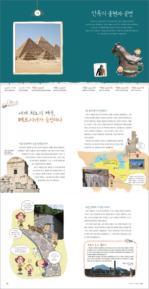 그리고 주요한 역사 사실들과 관련된 문화 유적지와 문화유산은 물론 상황을 묘사한 150여 장의 사진, 그림, 조각 등을 보여 줌으로써 관련 사실에 대한 흥미를 높일 수 있도록 하였으며, 역사를 공부하는 두 또래 친구 강이와 진이를 등장시켜 어린이들이 느낄 수 있는 학습적 부담을 덜고 잠시 쉬어 갈 수 있도록 하였습니다.