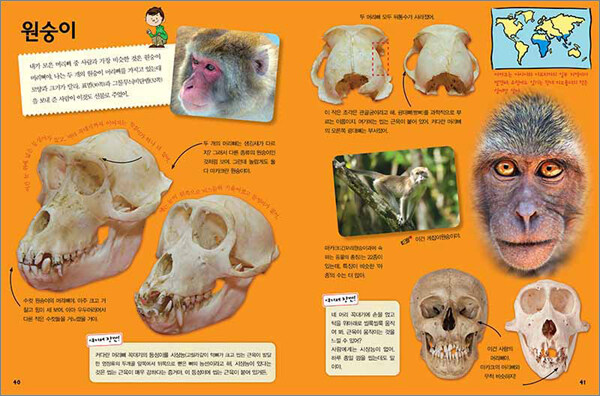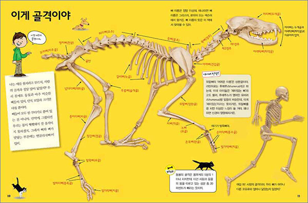 이 책에는 사람의 머리뼈와 비슷한 원숭이의 머리뼈, 다른 포유류보다 등뼈를 세 개나 더 가진 고양이의 골격, 연체동물처럼 뼈가 없을 것만 같은 뱀의 골반, 덩치에 비해 짧은 팔을 가진 티라노사우루스의 뼈대 등 아이들이 좋아할 만한 흥미로운 동물들이 다채롭게 등장한다.