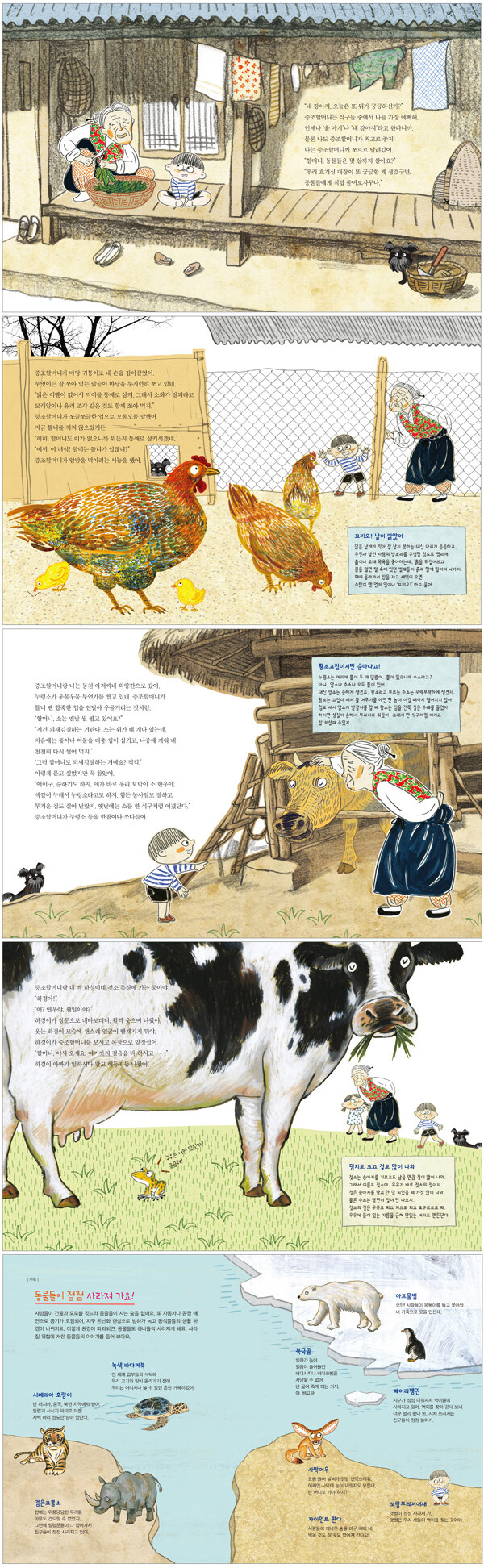 책 속에서는 멀리 있는 동물들이 아니라 예로부터 사람들이 집에서 기르며 친근하게 지냈던 가축들을 비롯한 가까운 동물들의 수명에 대해 이야기한다. 연우는 증조할머니 손을 잡고 동네를 한 바퀴 돌면서 동물들에게 직접 수명을 물어본다. 그림 속에서 연우와 동물들이 직접 대화를 나누듯이 표현하여 재미있는 스토리를 따라가다 보면 동물 수명과 생태에 대해 자연스럽게 알게 된다.