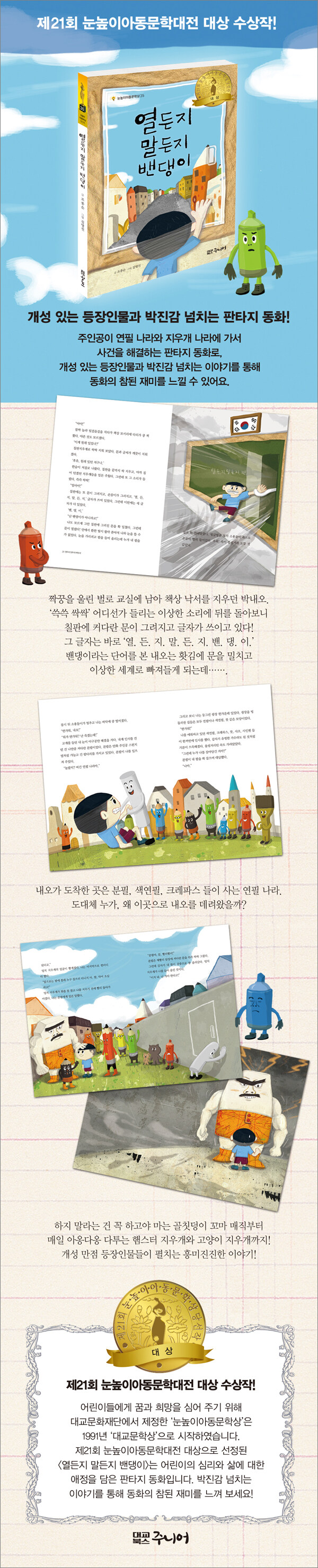 개성 있는 등장인물과 함께하는 박진감 넘치는 판타지 동화!제21회 눈높이아동문학대전 대상으로 선정된 〈열든지 말든지 밴댕이〉는 주인공이 연필 나라와 지우개 나라에 가서 사건을 해결하는 판타지 동화입니다. 지우개 대장과의 시합을 통해 '용서'에 대한 진정한 의미를 배우고, 개성 있는 등장인물과 박진감 넘치는 이야기를 통해 동화의 참된 재미를 느껴 보세요!