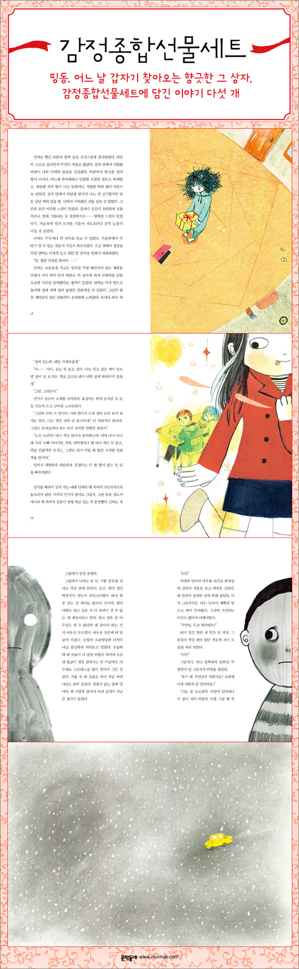 감정종합선물세트에 담긴 이야기 다섯 개단비는 침대에 엎드려 만화책을 보는 중이다. 갓 튀긴 팝콘을 한 주먹씩 입에 털어넣으며 한참 신 나게 웃고 있는데, 띵동, 초인종이 울린다. 짜증을 내며 현관으로 향한 단비를 기다린 것은 사람이 아니라 작은 상자 한 개. ‘태양초등학교 5학년 정단비’라고 또렷하게 적혀 있지만 보낸 사람 이름은 없다. 단비는 누가 몰래 보낸 선물일까 기대하며 조심스럽게 빨간 리본을 잡아당긴다.