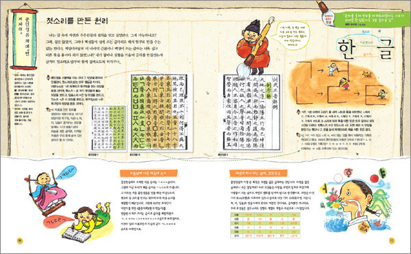 3. 세종 대왕과 정인지가 직접 설명하는 《훈민정음 해례본》!훈민정음은 세종 대왕과 8명의 집현전 학사가 비밀리에 만들었던 우리만의 글자였습니다. 이러한 훈민정음 창제의 주역인 세종 대왕과 《훈민정음 해례본》에 서문을 작성한 집현전 학사 대표 정인지가 아이들에게 직접 설명해 주는 형태로 구성하였습니다. 세종 대왕이 한자로 쓰여진《훈민정음 해례본》의 내용을 읊으면, 정인지가 다시 한 번 쉽게 설명해 줌으로써 어려울 법한 내용도 아이들이 쉽게 이해할 수 있습니다. 또한 마치 할아버지에게 듣는 이야기처럼 친근한 설명은 아이들이 우리의 글자를 더욱 가깝게 느끼도록 해줄 것입니다.