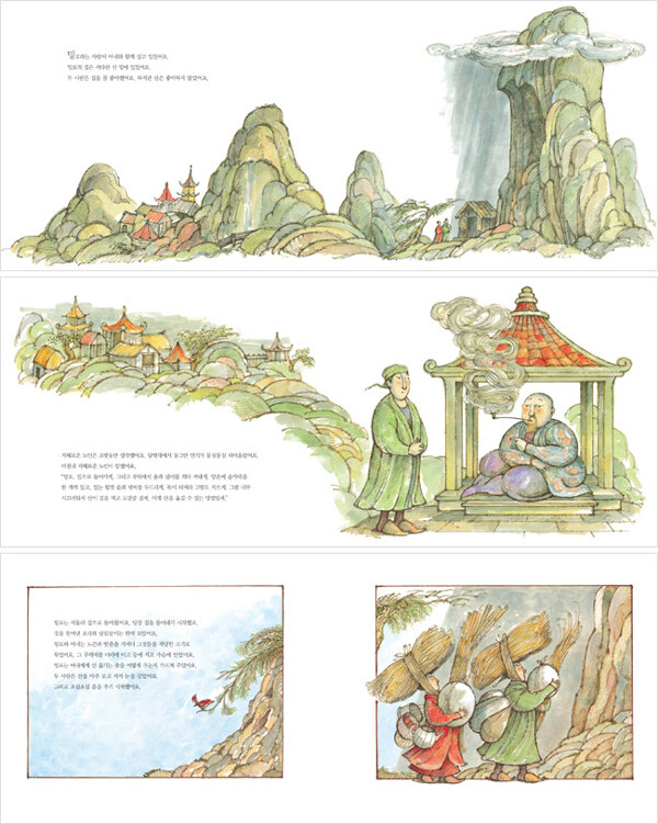 가장 지혜로운 노인의 가장 어리석은 가르침이 가져다준 행복 지혜로운 노인은 밍로가 찾아올 때마다 산을 옮기는 방법을 열심히 고민하고 알려 줍니다. 통나무로 산을 힘껏 밀어내기, 소란을 피워 산을 멀리 쫓아내기, 산신령에게 제물을 바쳐서 산을 옮겨 달라고 부탁하기. 마을에서 가장 지혜롭다는 노인이었지만, 그가 고민 끝에 알려 준 방법들은 이렇듯 하나같이 어리석기 짝이 없었어요. 게다가 거듭되는 실패 끝에 마지막으로 찾아온 밍로에게 ‘산을 옮기는 춤’이라고 알려 준 것은, 사실 산으로부터 멀리 떨어진 곳까지 ‘집을 옮기는 춤’이었지요. 하지만 아무려면 어때요. 밍로와 아내는 지혜로운 노인의 가르침을 진지하고 충실히 따른 덕분에 산으로부터 벗어나 아늑한 보금자리를 얻었고, 스스로 산을 옮겼다는 생각에 뿌듯하고 행복했으니 그걸로 충분하지요.