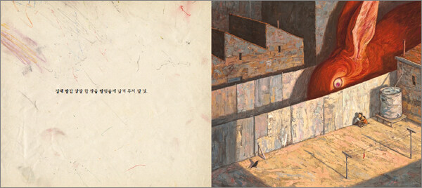 아이 둘을 오들오들 떨게 하는 동물로는 여러 가지가 있을 거예요. 커다란 검은 개, 늑대 등. 이런 동물들은 원래 무섭게 느껴지죠. 하지만 순한 초식 동물인 토끼를 무서워하는 사람은 별로 없을 거예요. 그래서 마치 거대한 괴물처럼 보이는 붉은 색의 토끼는 더욱 무섭게 느껴질 것 같았어요.