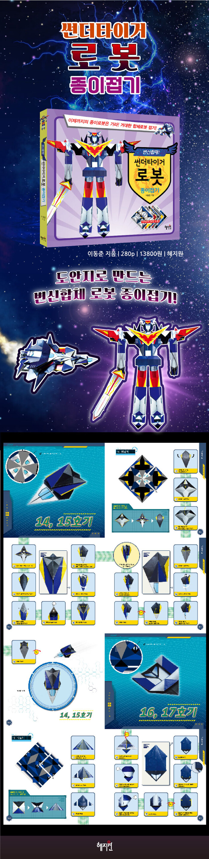 요즘 아이들이 쉽게 접하는 로봇 완구의 가장 큰 특징은 변신과 합체입니다. 필자가 처음으로 집필했던 ‘슈퍼트랜스 로봇 종이접기’에서 변신에 초점을 두고 종이접기를 해봤다면 저자의 두 번째 책인 썬더타이거 로봇 종이접기에서는 두 로봇이 합체하여 거대한 로봇이 탄생하는 합체 로봇 종이접기를 할 수 있습니다. 기존 로봇 종이접기에 비해 어렵지 않게 접을 수 있는 점 이외에도 다양한 비행 모드, 전차 모드의 유닛이 거대한 로봇으로, 거대한 두 로봇이 더욱 더 거대하게 합체하는 모습은 빨리 접고 싶어하는 욕구를 일으켜 줄 것입니다.