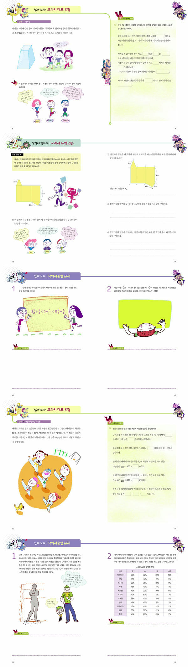 3. 딱딱하고 진지한 기존 문제집 형식에서 벗어나서 발랄한 일러스트와 캐릭터들로 스토리텔링 문제를 재미있게 구성하였습니다. 아이들은 재미있는 스토리텔링 서술형 문제에 몰입해서 서술형수학 실력을 키울 수 있습니다.
