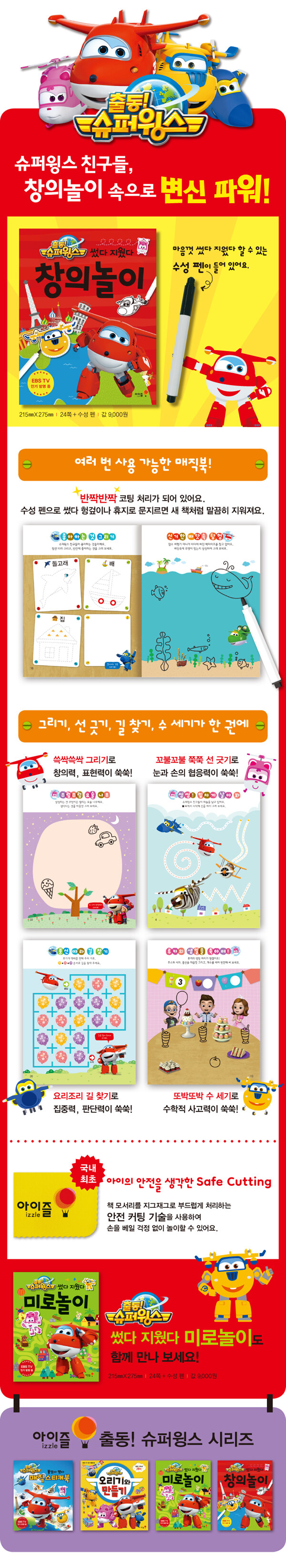 EBS TV 방영 애니메이션 [출동! 슈퍼윙스] 캐릭터와 함께 창의력을 키우는 놀이책이다. 그리기, 선 긋기, 길 찾기, 수 세기 등 다양한 활동을 한 권에 모두 담았다. 수성 펜으로 신나게 썼다 지우며 놀다 보면 창의력이 쑥쑥 자라난다.