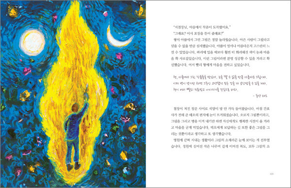 고흐보다 더 강렬하게 세상을 노랗게 물들인 일러스트레이션아이들이 읽는 미술 이야기는 적절한 일러스트레이션의 조합이 무엇보다 중요하다. 명화를 그대로 보고 이해하기에는 다소 무리가 있기 때문이다. 일러스트레이터 오승민은 고흐와 관련된 여러 가지 이미지를 때로는 환상적으로 때로는 사실적으로 묘사해 이야기를 읽는 재미를 배가시켰다. 특히 고흐보다 더 강렬한 노란색은 오랫동안 기억에 남는다.