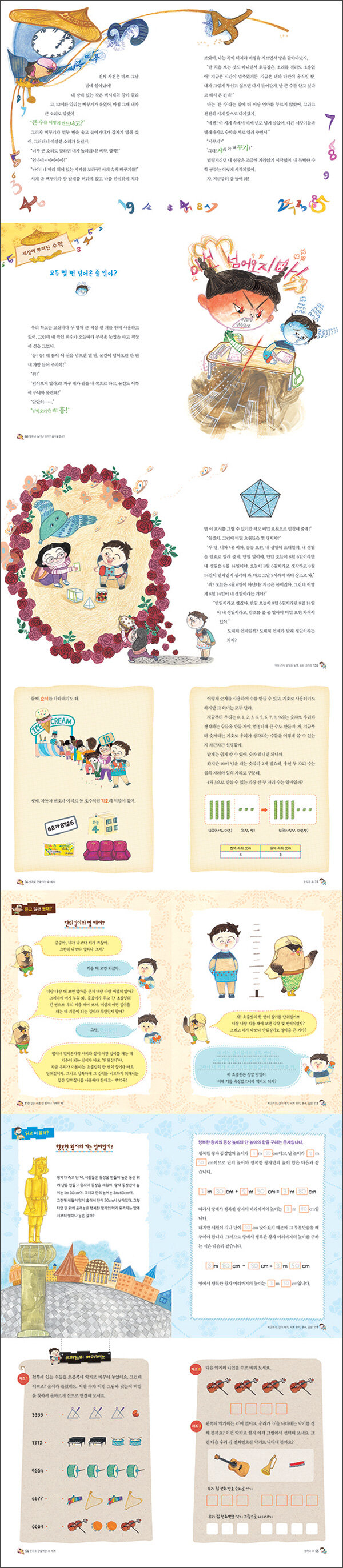 스토리텔링 교과서 어떻게 공부해야 할까요?2013년부터 수학 교과서의 전면 개정으로 많은 학생들과 부모님들, 심지어는 선생님들까지 수학을 어떻게 가르치고 어떻게 배워야 할지에 대한 혼란을 겪고 있다. 이 시점에서 서점에는 스토리텔링 수학이라는 이름을 달고 나온 수많은 책들이 쏟아지고 있다. 그중 대부분은 두 부류로 나뉘는데, 하나는 읽는 재미에 치중한 나머지 수학적 개념을 충분히 녹이기에 부족함이 있고, 또 하나는 수학적 개념에 맞추어 이야기를 끼워 맞추다가 오히려 개념의 오류를 가져오기도 한다. 모든 학문 분야가 그렇듯 수학도 최종적인 목표는 배우는 사람들로 하여금 올바른 개념과 원리를 자신의 것으로 습득하는 데 있다. 그래야만 그 기본적인 지식을 가지고 적용하고 응용하여 더 앞으로 나아갈 수 있기 때문이다.