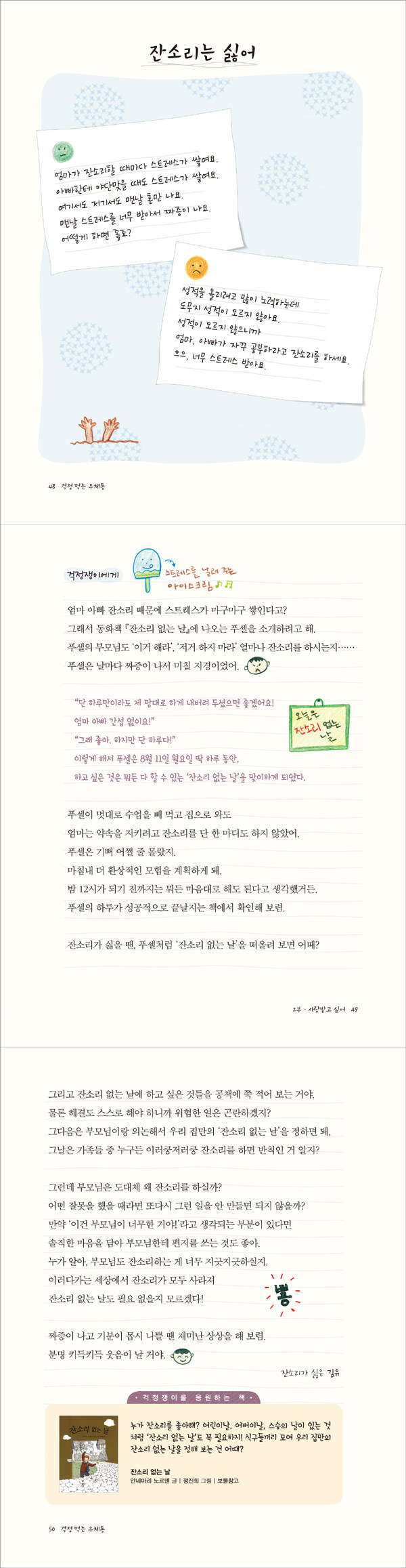 아이들의 편지라고 절대 장난처럼 대하지 않는다. 때로는 언니처럼, 때로는 엄마처럼, 때로는 선생님처럼, 또 때로는 친구처럼. 작가가 직접 그린 아기자기한 그림들과 가끔은 엉뚱하게, 가끔은 재미있게, 가끔은 진지하게 답변해 주는 작가의 편지가 정겹고, 고민 편지와 답장 편지를 읽다 보면 걱정으로 가득한 아이들의 목소리와, 진심이 가득하고 따뜻함이 묻어나는 작가의 목소리를 직접 듣는 것 같다.