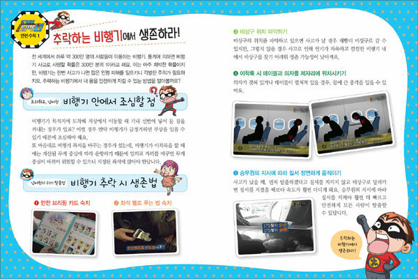 프로그램에서 소개된 일상생활에서 일어날 수 있는 안전사고의 실례를 실제 방송 화면과 함께 소개하여 내용에 사실성을 주었습니다. 소개된 실례들을 통해 평소 무심히 지나칠 수 있는 안전사고들에 대한 경각심을 심어 주고, 비슷한 상황에서 좀 더 안전하게 대처할 수 있는 방법을 알려 주고 있습니다. 또한 만화 속 주인공들이 위기 상황을 대처하는 모습을 통해 생활 속 안전 수칙을 쉽고 재미있게 배울 수 있고, 각 권마다 한 나라를 소재로 삼아 그 나라의 생활과 문화에 대한 부가 정보까지 얻을 수 있습니다.