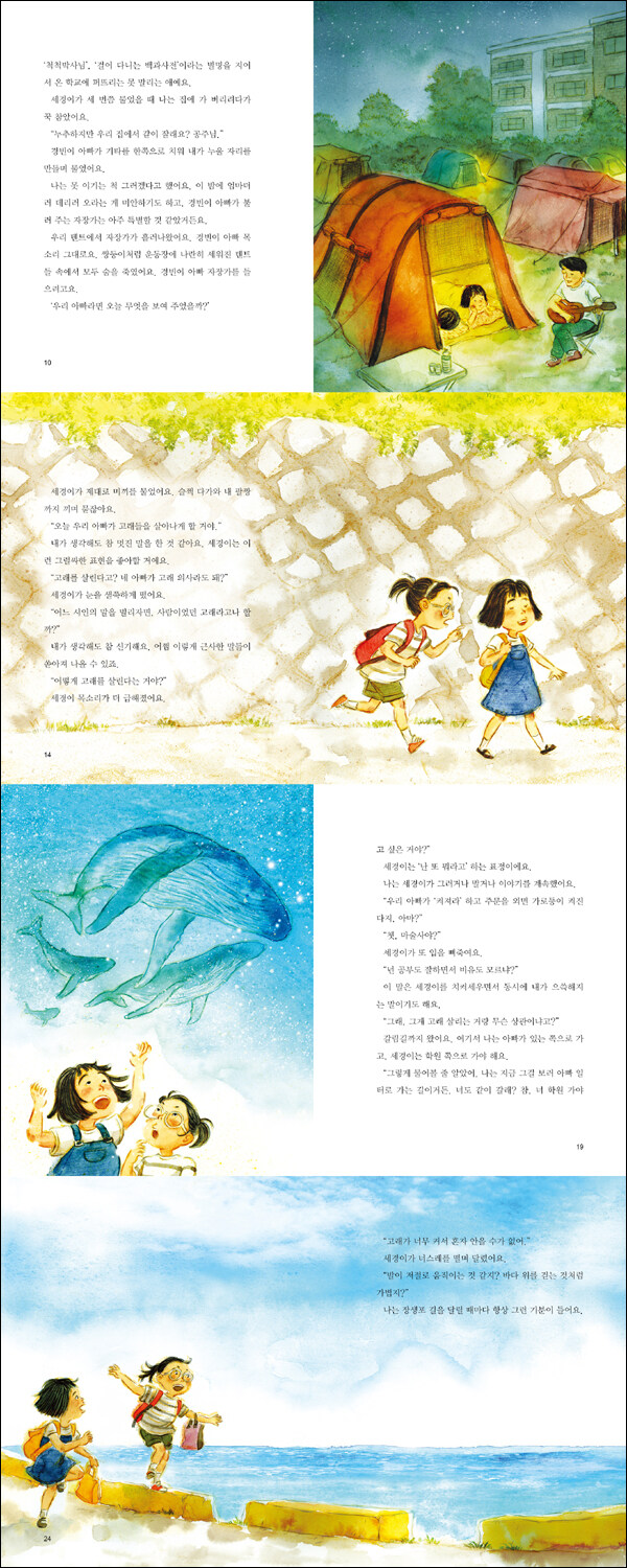 아빠의 가방에서 발견한 종이 한 장과 새 박사가 되고 싶었던 아빠의 이야기를 통해 가로등 불을 켤 수 있게 된 수진이는 비로소 아빠의 젊은 날 꿈과 진심을 이해하고 공감하게 됩니다. 고래 가로등에 담긴 아빠의 마음을 이해하며 장생포 길을 밝히는 수진이의 모습을 통해, 아빠와의 공감과 스스로 내적 성장하는 어린이의 마음을 알게 됩니다. 또, 아이들이 장생포 바닷가를 달리는 모습이나 함께 거니는 모습 등을 담은 섬세한 일러스트는 순수한 동심으로 안내합니다.