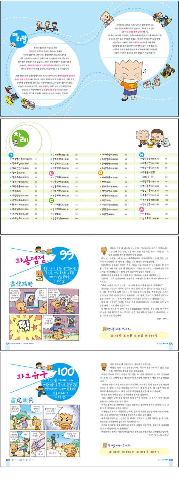 고사성어는 한자로 이루어져 있습니다. 그래서 어렵게 느껴지는 어린이 친구들이 많을 것입니다. 하지만 천천히 차례를 훑어보면 부모님이 대화할 때, 선생님이 말할 때 들었던 친근한 말들이 하나둘 보일 것입니다. 이렇듯 우리와 고사성어는 일상생활에서 뗄레야 뗄 수 없는 사이지요.