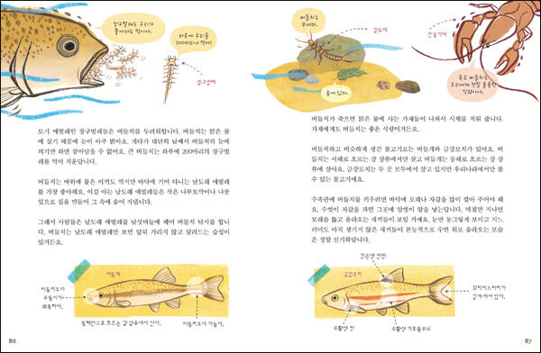 우리 민물에서 살아가는 생명들이 실제로 어떻게 태어나고 어떻게 살아 움직이고 있는지, 주변 환경의 생명들과는 어떻게 경쟁하고 도우며 살고 있는지, 살아남기 위한 자신만의 방식은 무엇인지 등 작가의 따뜻한 시선은 그것들을 놓치지 않고 이야기와 그림으로 담아냈다.