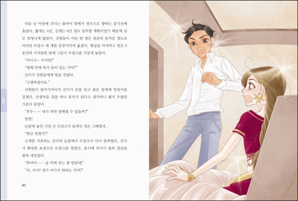 또 다시 시작된 역사 속 과거로의 여행. 리사는 영국 식민지 시절의 인도에서 결혼을 준비하는 어린 신랑, 간디를 만나게 됩니다. 그는 조혼에 불만이 많은 소년이었지만 아내 카스투르바를 보고 나서는 그녀에게 푹 빠졌답니다. 하지만 달콤한 신혼을 즐기다 그만 병든 아버지의 임종을 놓치게 되고, 간디는 그 죄책감을 이기지 못하고 그후로 아내를 멀리하는 금욕적인 생활을 고집합니다. 리사는 외면받는 카스투르바가 가여워 간디를 설득해보기도 했지만 그는 꼼짝도 하지 않았어요. 그리고 간디는 법조인이 되기 위해 영국 유학을 떠나기로 합니다. 영국에서의 인종차별을 겪고 인도로 돌아온 간디는 인도인에 대한 영국의 차별대우가 얼마나 심각한지 깨닫고 인도 독립을 위해 일하겠다고 결심합니다. 그런 그의 곁에는 남편의 냉대에도 굴하지 않고 곁을 지키며 내조하는 아내 카스투르바가 있었습니다.