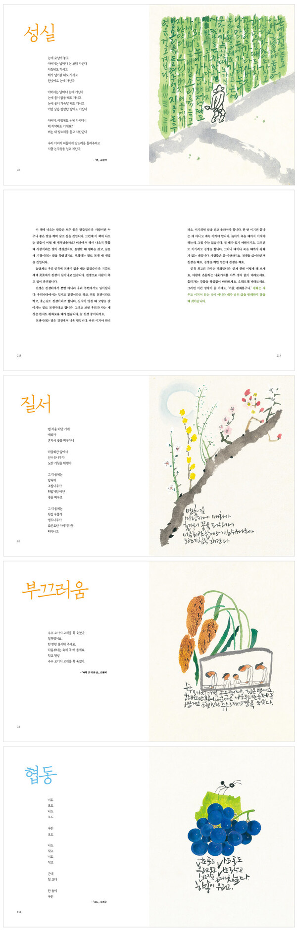그런 그가 평생을 기대고 살아온 아름다운 가치와 인생 덕목을 들려주는 《어린이 인성 사전》을 펴냈다. 시인의 어머님이 몸소 보여주신 소통의 방식, 농사꾼 아버지가 살아오신 성실한 뒷모습, 교사로 40여 년을 살아온 본인이 느낀 존경의 참의미 등 작가의 삶 속에서 끌어 올린 귀한 말들을 담았다. 사랑, 정직, 진실, 정의, 평화, 소통, 자연. 이런 낱말들에 기대어 평생을 살았다고 하니 분명 사전이라 할 만하다. 그래서인지 작가의 인생이 담긴 이 책은 따뜻한 온정이 흐르기도 하지만 정신 바짝 들게 따끔하기도 하다.