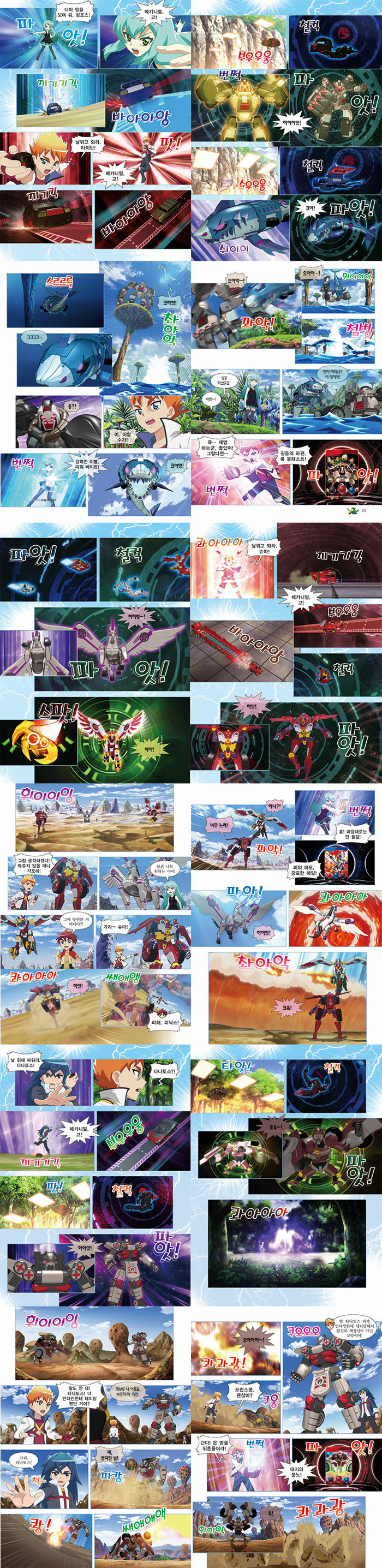 자동차 변신 로봇 애니메이션 [터닝메카드] 캡처 애니북. 미니카를 좋아하는 소년, 찬은 우연한 계기로 다른 세계에서 온 미니카 생명체인 메카니멀, 에반을 만나 친구가 된다. 에반과 함께 에반의 동생인 타나토스를 찾기로 한 찬은 메카니멀을 나쁜 일에 사용하려는 블랙미러를 막기 위해 블루랜드의 이소벨, 레드홀의 이안과 손을 잡고 메카니멀 쟁탈전에 참가하게 되는데….