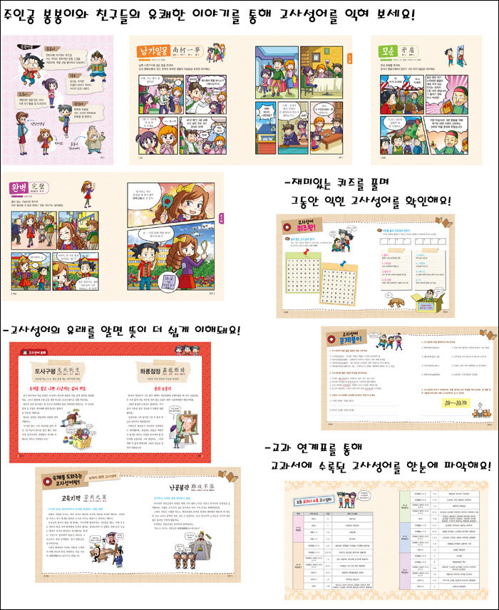 고사성어를 익히면 일상생활의 언어 표현력뿐만 아니라 고사성어에 담긴 삶의 지혜와 교훈을 통해 세상을 바라보는 안목까지 기를 수 있다. 만화를 통해 익힌 고사성어는 재미있는 퀴즈를 풀며 확인해 볼 수 있다.