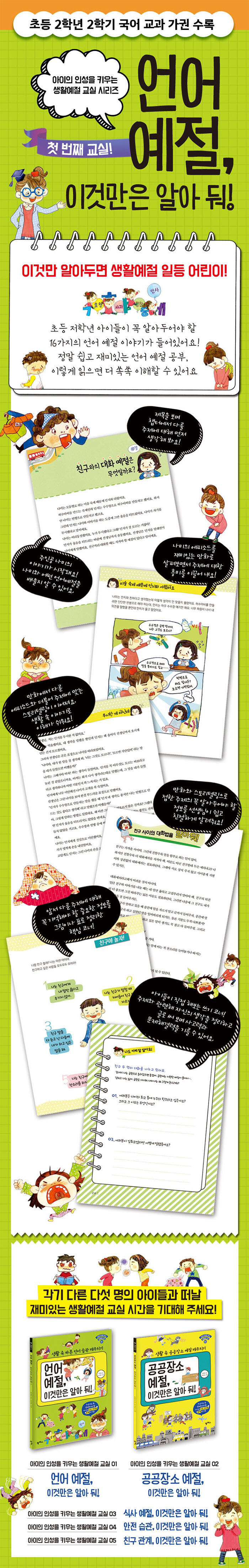 언어 예절부터 공공장소 예절, 식사 예절, 안전 습관, 친구 관계의 다섯 권으로 이루어진 [아이의 인성을 키우는 생활예절 교실] 시리즈는 아이의 일상생활 속에서 겪는 사소하지만 가장 기본적인 기초 교양을 쉽고 재미있게 알려줍니다. 작은 예절과 습관 하나하나가 모여 아이의 바른 인성을 이루는 바탕이 되어줄 것입니다. 만화와 스토리텔링, 쉽게 풀어쓴 정보글과 쓰기 코너로 이루어져 있어 부모와 아이가 함께 놀이처럼 익힐 수 있습니다.