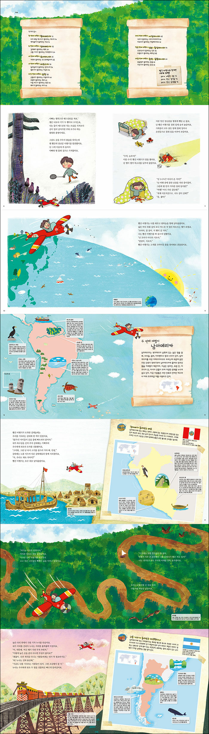 부드러운 색감의 아기자기한 그림들이 책의 가장 큰 특징은 구성에 따라 여러 가지 기법이 사용된 그림들이 조화를 이루며 여러 범주의 내용을 저마다 효과적인 방식으로 전달하고 있다는 것입니다. 왼쪽 페이지를 따라 흐르는 스토리컷은 크레용의 투박한 터치감을 이용해 탈것과 그 나라의 정경을 동화처럼 표현하고 있습니다. 본문 오른쪽 페이지와 장 표지에 배치된 지도와 지리 요소들은 깔끔한 일러스트 스타일로 정보를 전달하며, 카툰 스타일의 지오와 빨간 비행기 캐릭터는 친근하고 귀여운 이미지로 단번에 독자들의 마음을 사로잡습니다. 지오의 발그레한 볼과 활짝 웃을 때 드러나는 앞니를 보면 종잇장을 잡고 볼을 꼬집어 주고픈 충동을 느끼며 단번에 그들의 친구가 되지요.