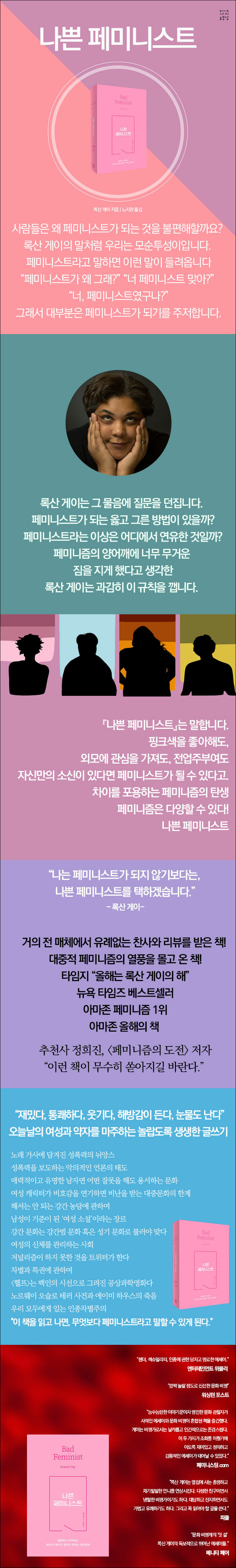 미국에서 페미니즘 열풍을 불러일으킨 책!2014년 미국에서 출간 후, 거의 모든 매체가 열광하면서 유례없는 찬사와 리뷰를 받은 책. 아마존 여성분야 1위(출간 후 지금까지)를 기록하며, <뉴욕타임즈> 베스트셀러에 올랐고, 아마존 올해의 책에 선정됐으며, 타임즈는 “2014년은 록산 게이의 해”라고 선언했다. 두 권의 소설을 펴낸 바 있고, 퍼듀 대학 교수로 재직 중인 74년생의 젊은 록산 게이는 이 책으로 일약 ‘스타덤’에 올랐다. 이 책은 특히 미국의 젊은 층을 중심으로 폭발적인 사랑을 받았으며, 우리 시대 페미니즘의 새로운 고전으로 떠올랐다. 대중과 평단의 지지를 받으며 미국에서 가장 영향력 있는 성찰적 지식인으로 떠오른 록산 게이는 얼마 전 <뉴욕타임즈>(2016년 2월)에 유색인종을 차별하는 아카데미상을 보이콧하자는 주장의 글을 기고한 바 있다.
