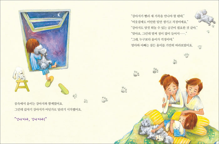 강아지를 새 가족에게 데려다 주던 날, 윤이는 넓은 들판이 있는 새 집에서 즐겁게 뛰어노는 강아지를 보면서 강아지를 위하는 것이 어떤 것인지 다시 생각하게 됩니다. 그리고 그제야 행복한 마음으로 강아지를 보낼 수 있다는 마음을 갖게 됩니다. 비록 강아지와 헤어졌지만 집으로 돌아오는 꿈속에서 강아지와 만난 즐겁게 뛰어노는 꿈을 꾸는 윤이의 모습처럼 윤이는 언젠가 또다시 강아지와 만나게 될 수 있을 거라는 희망을 갖습니다.