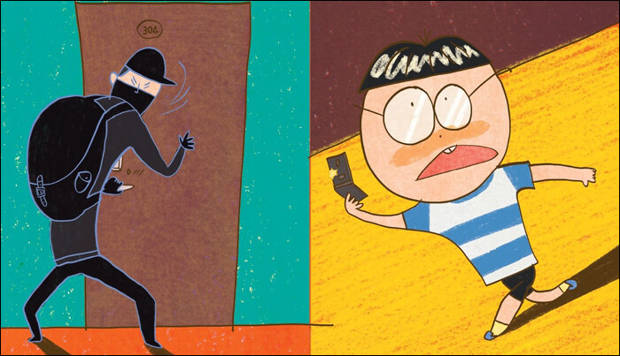 □ 옆집에 누가 사는지도 모르는 현대 사회의 단면을 날카롭게 풍자한 작품!<별난반점 헬멧뚱과 X사건>에서 도난 사건이 벌어지는 곳은 오동이가 사는 남남빌라이다. 빌라 이름에서 알 수 있듯 남남빌라에 사는 사람들은 남남인 것처럼 서로에게 무관심하다. 오동이도 엄마 말에 따라 누가 와도 절대 문을 열어 주지 않는다. 짜장면 배달비도 문밖 우유 배달 봉투에 넣어 놓고, 짜장면 가격이 올라 500원을 더 내라는 헬멧뚱에게는 그릇 찾아갈 때 우유 배달 봉투에서 찾아가라고 말한다. 인터폰을 통해서만 헬멧뚱을 본 오동이는 도둑을 추적하는 과정에서 실제 헬멧뚱을 보고 예상했던 것보다 훨씬 크고 뚱뚱한 모습에 당황하고 만다. 택배 배달부나 우체부가 와도 절대 문 열어 주지 말라는 오동이 엄마의 당부는 실제 이 시대를 사는 부모들의 마음을 대변하고 있다. 이 작품은 ‘집 안’으로 한정된 도시 생활의 폐해를 ‘집 밖’ 낙서에 대한 아이의 호기심을 통해 드러냈다. 세상이 흉흉하다며 꽁꽁 문을 닫고 살게 되면서 점점 타인에 대한 마음까지 닫게 된 건 아닐까. 점점 타인의 삶에 무관심해져 가는 우리 모습을 다시금 돌아보게 한다.