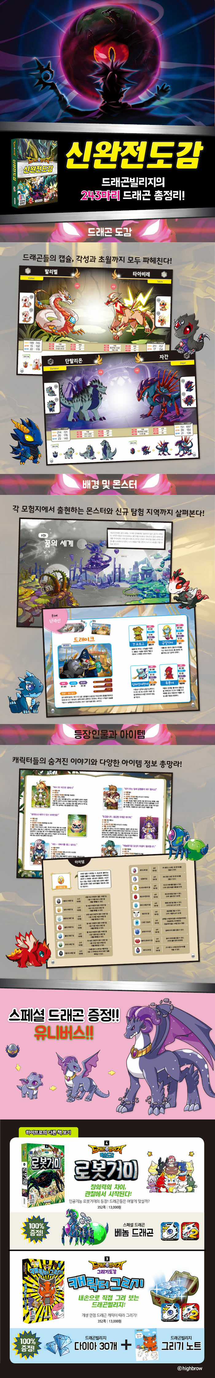 더욱 완벽해진 모바일 RPG 드래곤빌리지의 게임 도감!드래곤빌리지 <신완전도감>에선 최신 업데이트 된 게임 콘텐츠를 모두 담았어요. 기존의 드래곤들뿐만 아니라, 화려하고 멋지게 리뉴얼 된 드래곤까지 총 243마리의 방대한 드래곤 정보가 수록되어 있습니다. 새롭게 추가된 탐험 지역인 '꿈의 세계'와 각 지역의 무시무시한 보스 몬스터들의 도감 내용은 모험을 준비 중인 유저들에겐 놓칠 수 없는 필수 정보! 또한 도감 최초로 드래곤빌리지의 모든 아이템을 낱낱이 분석하여 아이템 도감으로 구성하였습니다. 드래곤빌리지 월드에는 어떤 보물들이 숨겨져 있었는지 <신완전도감>에서 찾아보세요!