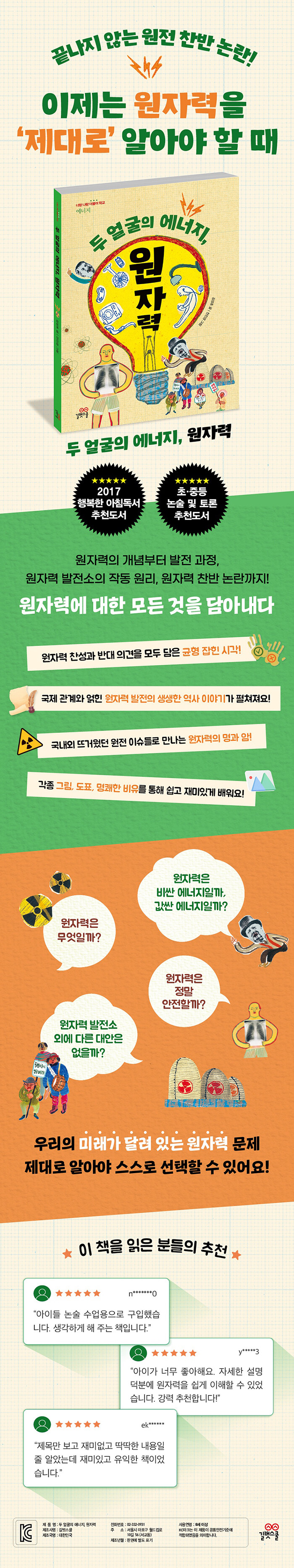 균형 잡힌 시각으로 원자력을 다루다이 책은 원자력의 개념, 원자력 발전소의 작동 원리 등은 물론, 원자력을 찬성하는 쪽과 원자력을 반대하는 쪽의 주장을 균형 있게 다루고 있다. 일방적인 주장에 초점을 맞추기보다는 양쪽의 주장을 뒷받침하는 근거 또한 풍부하게 제시하고 있어 폭넓은 시각으로 원자력을 이해할 수 있다. 이를 바탕으로 우리 아이들이 원전에 대해 스스로 판단해 보고 미래를 설계할 수 있을 것이다.