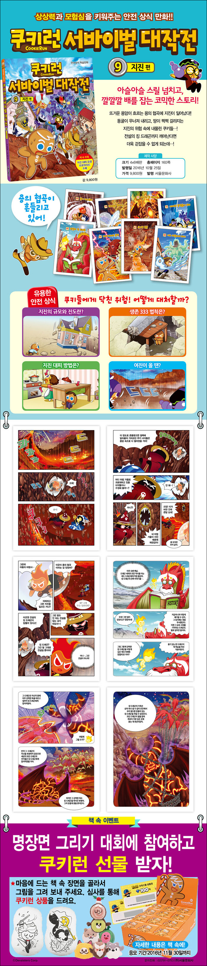 상상력과 모험심을 키워주는 서바이벌 탐험 학습만화. 뜨거운 용암이 흐르는 용의 협곡에 지진이 일어난다. 동굴이 무너져 내리고, 땅이 쩍쩍 갈라지는 지진의 위험 속에 내몰린 쿠키들. 전설의 킹 드래곤까지 깨어난다면 더욱 걷잡을 수 없게 되는데…. 9권 '지진' 편에서는 더욱 흥미진진한 이야기와 함께 안전 상식을 배워 본다.