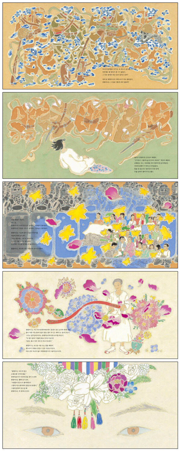 4. 일본과 중국에서도 출간됩니다.『꽃할머니』는 ‘한중일 공동기획 평화그림책’ 시리즈의 첫 번째 작품으로 우리나라에서 뿐만 아니라 일본과 중국에서도 곧 출간됩니다(10월 예정. 국내에서는 주인공인 심달연 할머니께서 고령인데다가 건강 사정이 있어 다른 두 나라보다 서둘러 출간하게 되었습니다).