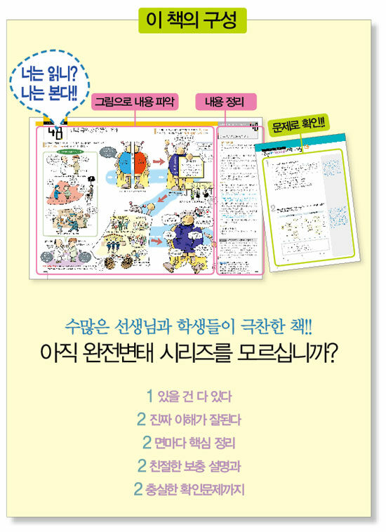 <중학생이 되기 전에> 시리즈와 <쉽게 보는 수능4교시>가 기존의 스토리 만화 형식을 취한 데 비해 <완전변태>는 일러스트와 만화가 결합된 열린 만화 형식을 취했다. 자칫 학습보다는 스토리 전개에 이끌릴 수 있는 독자의 관심을 학습에 집중시킬 수 있게 하겠다는 의도. 현직 교사들의 꼼꼼한 감수를 거쳐 오류를 방지한 것도 학습에 분명한 포인트를 두었음을 나타낸다.