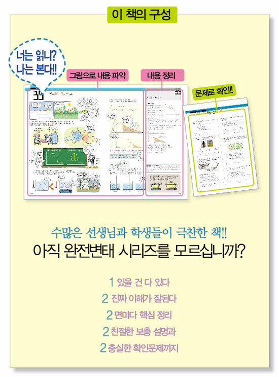 <중학생이 되기 전에> 시리즈와 <쉽게 보는 수능4교시>가 기존의 스토리 만화 형식을 취한 데 비해 <완전변태>는 일러스트와 만화가 결합된 열린 만화 형식을 취했다. 자칫 학습보다는 스토리 전개에 이끌릴 수 있는 독자의 관심을 학습에 집중시킬 수 있게 하겠다는 의도. 현직 교사들의 꼼꼼한 감수를 거쳐 오류를 방지한 것도 학습에 분명한 포인트를 두었음을 나타낸다.