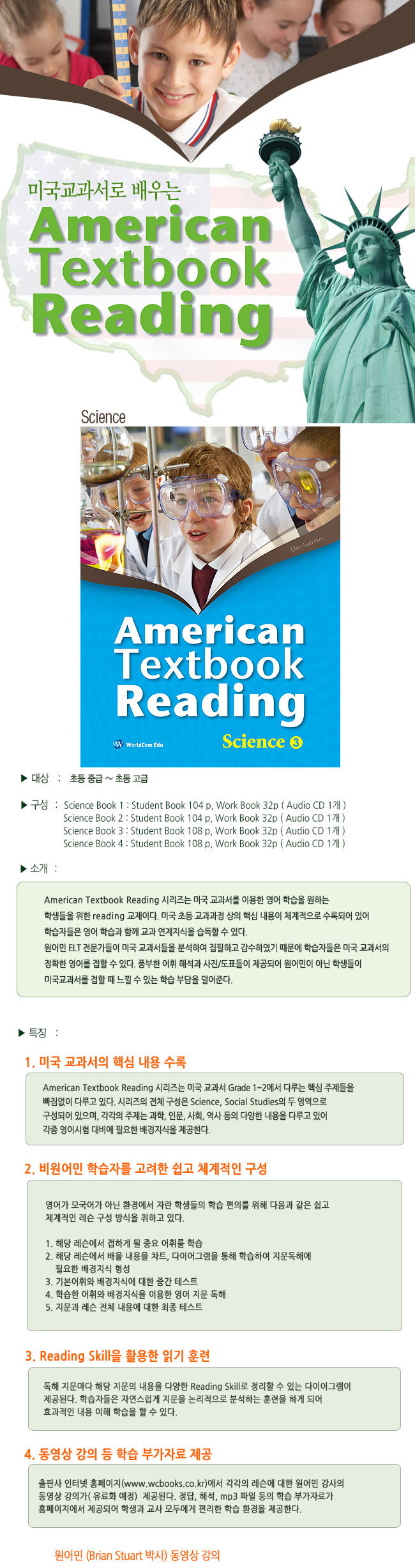미국 교과서를 이용한 영어 학습을 원하는 학생들을 위한 Reading 교재이다. 미국 초등 교과과정 상의 핵심 내용이 체계적으로 수록되어 있어 학습자들은 영어 학습과 함께 교과 연계지식을 습득할 수 있다. 원어민 ELT 전문가들이 미국 교과서들을 분석하여 집필하고 감수하였기 때문에 학습자들은 미국 교과서의 정확한 영어를 접할 수 있다. 풍부한 어휘 해석과 사진, 도표들이 제공되어 원어민이 아닌 학생들이 미국교과서를 접할 때 느낄 수 있는 학습 부담을 덜어준다.
