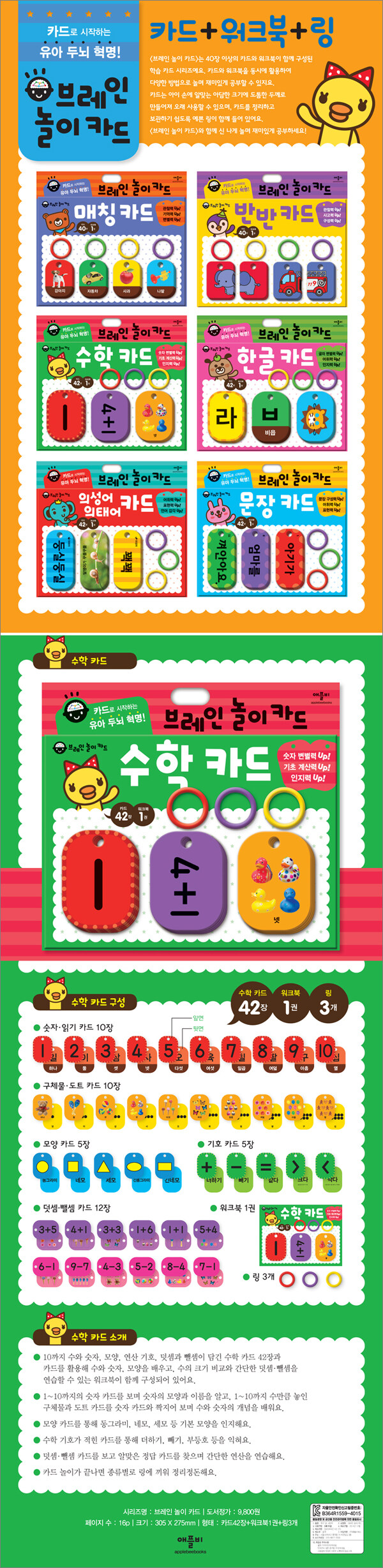 카드로 시작하는 유아 두뇌 혁명, 브레인 놀이 카드<브레인 놀이 카드>는 40장 이상의 카드와 워크북이 함께 구성된 학습 카드 시리즈예요. 카드와 워크북을 동시에 활용하여 다양한 방법으로 놀며 재미있게 공부할 수 있지요. 카드는 아이 손에 알맞는 아담한 크기에 도톰한 두께로 만들어져 오래 사용할 수 있으며, 카드를 정리하고 보관하기 쉽도록 예쁜 링이 함께 들어 있어요.