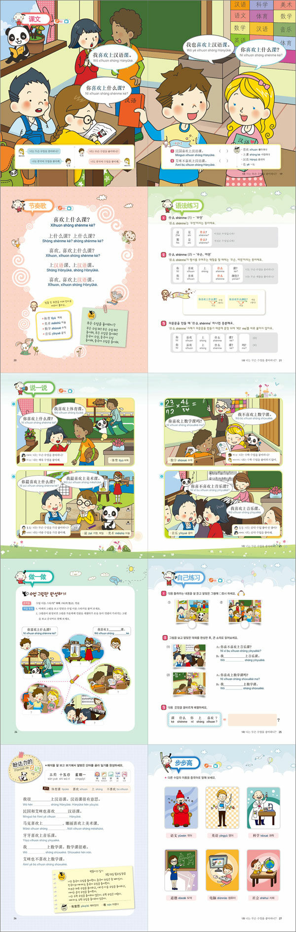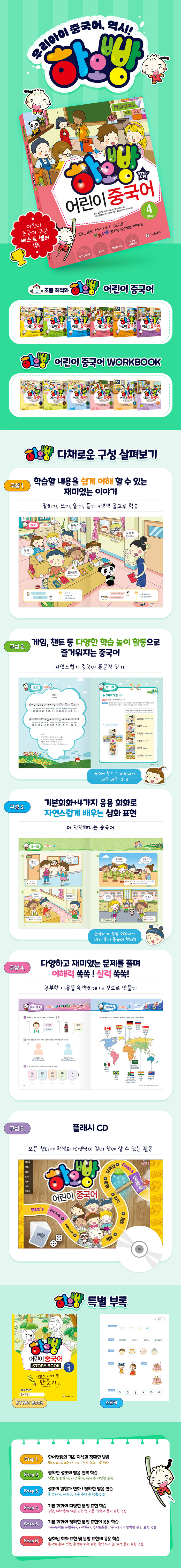 한국, 중국, 미국 3개국 어린이들이 좌충우돌 펼치는 재미있는 이야기!!본 교재에서는 탄탄한 내용의 연계성을 바탕으로 체계적이며 재미있게 복습할 수 있도록 구성했습니다. 본문에서는 핵심 문장을 짧고 재미있는 회화로 연습하고, 챈트에서는 본문의 내용을 다시 복습함과 동시에 단어 교체연습을 통하여 응용회화의 내용을 미리 예습할 수 있습니다. 간단한 문법 정리를 통하여 회화를 배우면서 중국어 문법체계를 자연스럽게 확립할 수 있고, 다양한 게임활동과 연습문제, 일기쓰기, 중국어 동요 등을 통해 배운 내용을 다시 한 번 되새깁니다. 복습과는 앞에서 배웠던 중국어 표현을 아이들에게 친근한 동화 스토리에 대입하여 아이들이 역할극을 하면서 재미있게 복습할 수 있어 학습효과는 배가 됩니다.