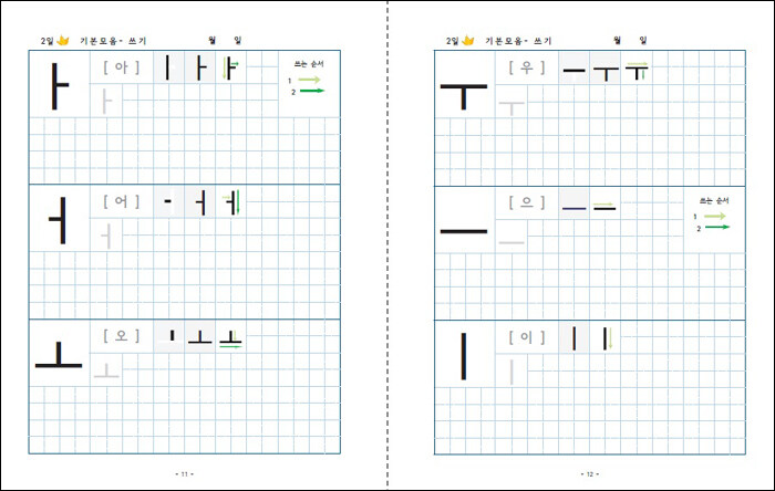 기본자음, 기본모음, 가획, 받침, 복잡한 모음, 간단한 문장 순서로 창제원리를 따라 체계적으로 익히도록 구성되어 있습니다.