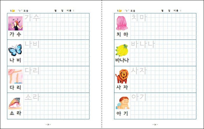 음가에 해당하는 단어를 수집하고 단어를 그림으로 나타내어 이해를 도왔는데 교재의 그림은 저자가 일일이 수채화 작업을 하여 책의 완성도를 높여 딱딱한 교본이라기보다는 동화책을 보는 듯 부드럽고 따뜻한 느낌을 줍니다.