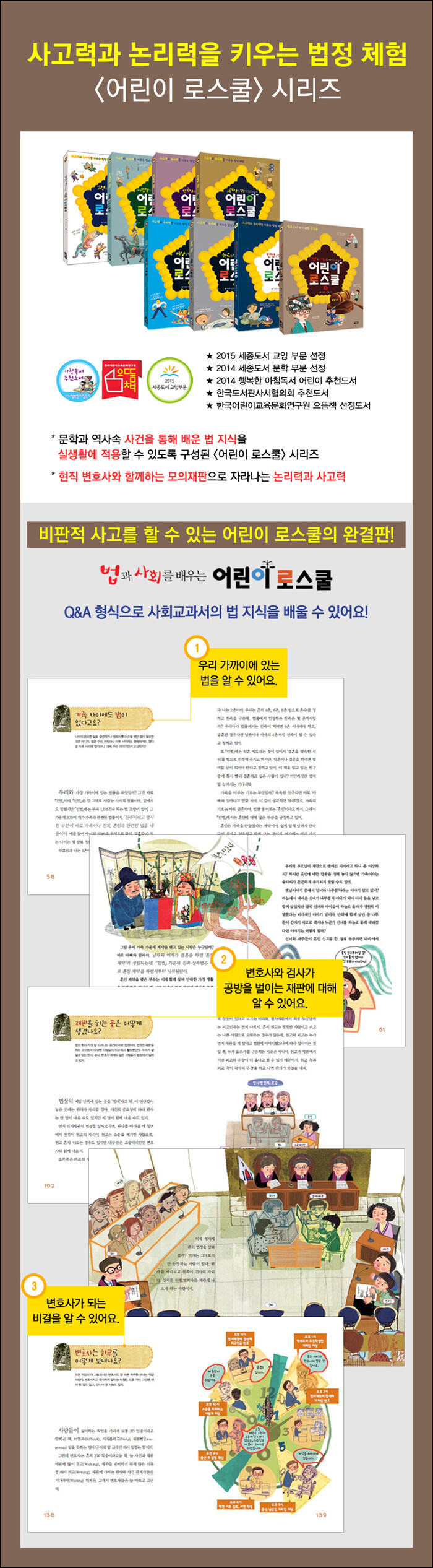 어린이 로스쿨 시리즈는 어린이들에게 단지 법적인 지식을 쌓는 것이 아니라 어떤 문제에 대해 토의와 토론을 하면서 합리적이고 논리적인 해결책을 찾고, 비판적인 사고를 할 수 있도록 도와줍니다.