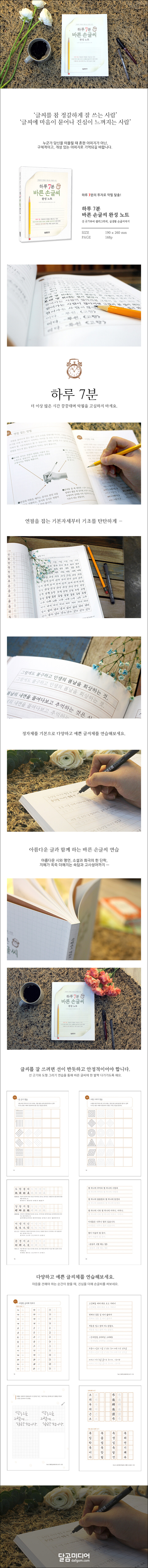 많은 시간 끙끙대며 악필을 고심하지 마세요.하루에 한 번, 적은 시간을 투자해 꾸준히 글씨 교정 연습을 한다면 악필에서 명필로 거듭나는 것, 어렵지 않습니다. 바르게 또박또박 쓴 글씨체, 나의 개성을 살려 나를 대변해 주는 예쁜 글씨체. 욕심나지 않으세요? ≪하루 7분 바른 손글씨 완성 노트≫가 도와줄 것입니다. 아름다운 시와 명언, 소설과 희극의 한 단락, 지혜가 쏙쏙 더해지는 속담과 고사성어까지. 예쁜 글씨체로 다양하게 연습해 볼 수 있습니다.