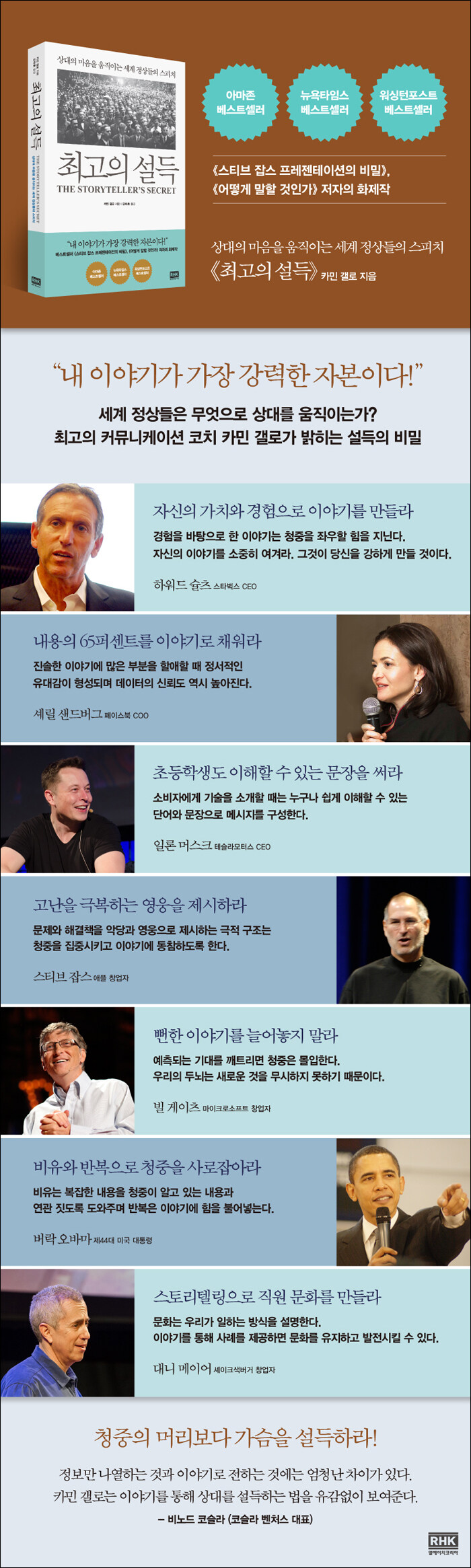 세계 정상들은 어떻게 상대를 사로잡는가?구글, 인텔, 링크트인, 코카콜라 등 세계 최정상 기업과 리더들을 상대해온 미국 최고의 커뮤니케이션 코치 카민 갤로가 상대의 마음을 움직이는 비법이 담긴 새로운 책을 내놓았다. TED 명강연을 정밀 분석하여 그 성공 요인을 공개한 《어떻게 말할 것인가Talk Like TED》와 10여 년 넘게 스티브 잡스를 연구하여 그의 30년 프레젠테이션 노하우를 집대성한 《스티브 잡스 프레젠테이션의 비밀》을 통해 화술 연구의 정수를 보여준 그가, 최고의 설득을 위한 방법으로 꼽는 것은 바로 스토리텔링 능력이다.