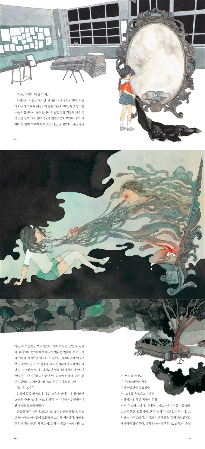 그 거울에서 들려오는 섬뜩한 속삭임6학년이 된 연주는 1학년 때 한 반이었던 태영이를 다시 만나게 된다. 인기 많은 태영이는 늘 친구들의 관심과 주목을 끌지만 연주는 그 반대이다. 친구들에게 따돌림과 괴롭힘을 당해 왔고, 최근에서야 누구의 눈에도 띄지 않는 그런 존재가 되었다. 튀지 않게 일 년을 보내고 싶은 연주에게 태영이 문예부에 들 것을 권한다. 할 수 없이 문예부가 된 연주는 네 명의 아이들과 함께 오래된 건물의 낡은 교실로 향한다. 그곳에는 황금 장식을 두른 큰 거울이 하나 있다. 거울은 연주를 사로잡았다. 거울에 홀린 건 태영이도 마찬가지였다. 그런 중에 문예부 동아리 장을 두고 태영이와 선경이 사이에 균열이 생긴다. 나머지 아이들 역시 두 친구 사이에서 저울질하고 이간질하며 위태로운 싸움을 벌인다. 친구에게 외면 받지 않기 위해, 홀로 남겨지지 않기 위해 아이들은 서로의 마음속을 짐작하느라 분주하다. 이 틈바구니로 거울의 속삭임이 들려온다. “너 불안하지? 친구들이 다 떠나갈까 봐. 내가 도와줄게. 다른 아이들의 마음을 사로잡게 해 줄게.” 거울 속에 갇힌 아이, 그 정체는 무엇일까?