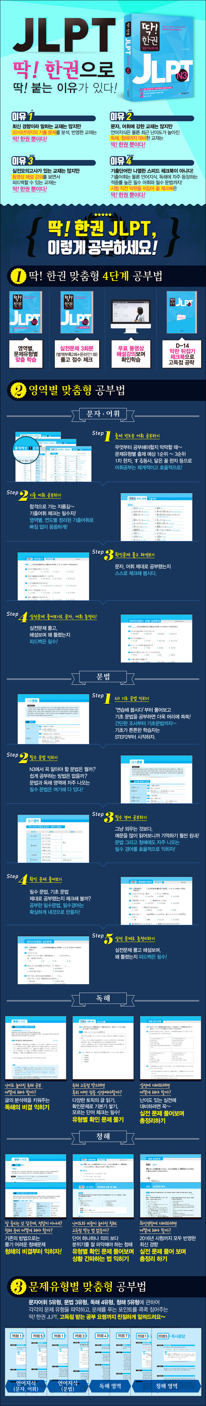新일본어능력시험 개정안에 따라 2010년부터 2016년까지 새롭게 출제 된 기출 문제를 철저히 분석하여, 일본어 능력시험 초보자를 위한 상세한 설명과 다량의 확인 문제를 수록하고, 고득점을 노리는 학습자들을 위해 난이도 높은 실전문제를 다루었다. 특히, JLPT연구모임에서 적중률과 난이도를 연구하여 제작한 질 높은 실전 모의테스트는 동영상강의도 제공하며, 혼자서도 일본어 능력시험을 충분히 합격할 수 있도록 제작한 수험서이다.