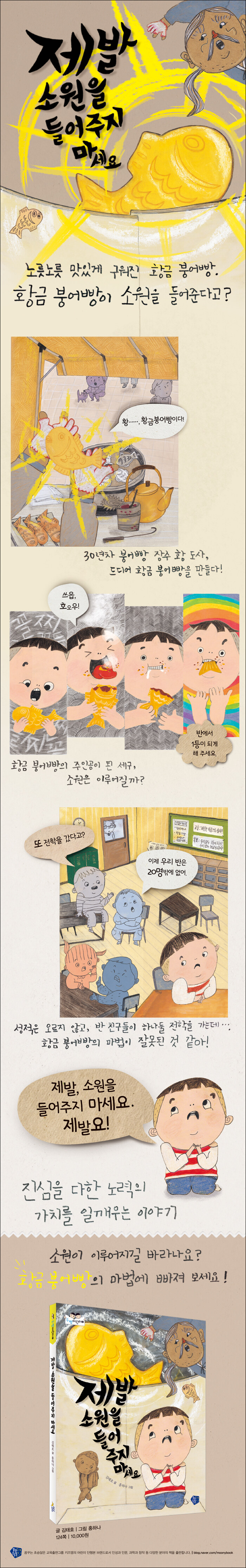 소원 성취 황금 붕어빵? 아니야, 제발 소원을 들어주지 마세요! 황 도사네 붕어빵 집에서 드디어 황금 붕어빵이 나왔어요. 황 도사는 30년째 한길만을 걸어온 붕어빵 장수예요. 전설에 따르면 황금 붕어빵은 먹는 이의 소원을 이루어 주는 마법의 붕어빵이에요. 하루가 멀다 하고 이곳을 찾는 단골손님 세구가 황금 붕어빵의 주인공이 됐지요. 세구는 황금 붕어빵을 먹으며 반에서 1등을 하게 해 달라고 빌었어요. 세구는 늘 꼴찌에서 두 번째를 차지하거든요. 다행히 꼴찌는 단짝 영만이가 늘 도맡아 줘요.