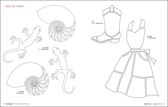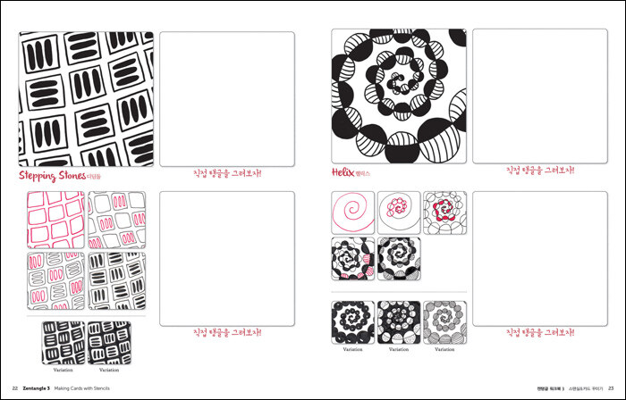 믹스미디어란 관점에서 스텐실은 젠탱글과 가장 잘 조화되는 분야로, 젠탱글이 어떻게 확장될 수 있는지 보여주는 단적인 사례다. 책 속에는 스텐실과 카드를 위한 흥미로운 활용 팁들은 물론, 아기자기한 스텐실 도안들이 실려 있어 곧바로 작품을 만들 수 있다. 그리고 보너스로 40가지의 새로운 탱글도 소개하고 있다.